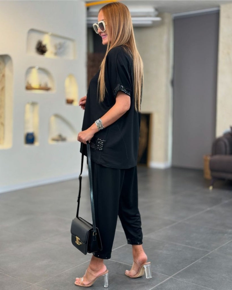 Composé d'un haut ample à col en V et d'un pantalon assorti, cet ensemble est parfait pour toutes les occasions. Conçu avec une touche d'éclat, il apporte du glamour tout en assurant un confort absolu.