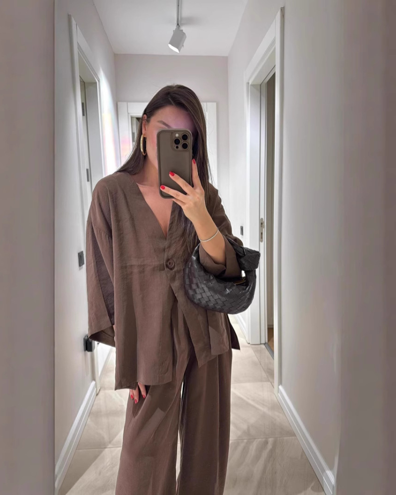 Adoptez un look à la fois décontracté et raffiné. Cet ensemble léger de 2 pièces associe un haut fluide à décolleté en V et un pantalon à jambes larges pour une parfaite combinaison de confort et d'élégance. Que vous alliez au brunch ou preniez un vol, cet ensemble vous garde à la fois confortable et chic toute la journée.